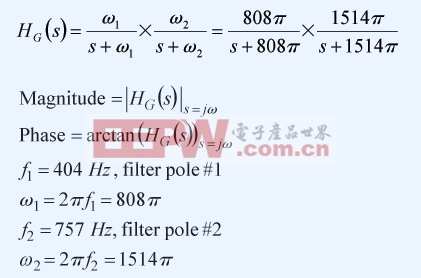 此外,每个陀螺仪传感器在通过ADC模块之前都会通过双极低通滤波器。这样可以提供足够的信息,以便使用拉普拉斯变换来开发S域中的传递函数表示。第一极(f1)的频率为404 Hz,第二极(f2) 的频率为757 Hz.