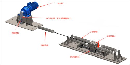 本次疲劳试验采用拉绳式激振器进行加载,由电动机驱动曲臂旋转,进而带动激振弹簧产生往复运动,模拟真实风机运行环境下的长周期动态负载工况。激振频率设定为1.4Hz,阻尼器全行程运行,最大振幅达±0.4米,相当于实际运行阻尼器安装20-40米位置的叶片摆振振幅±0.27米的能量等级。